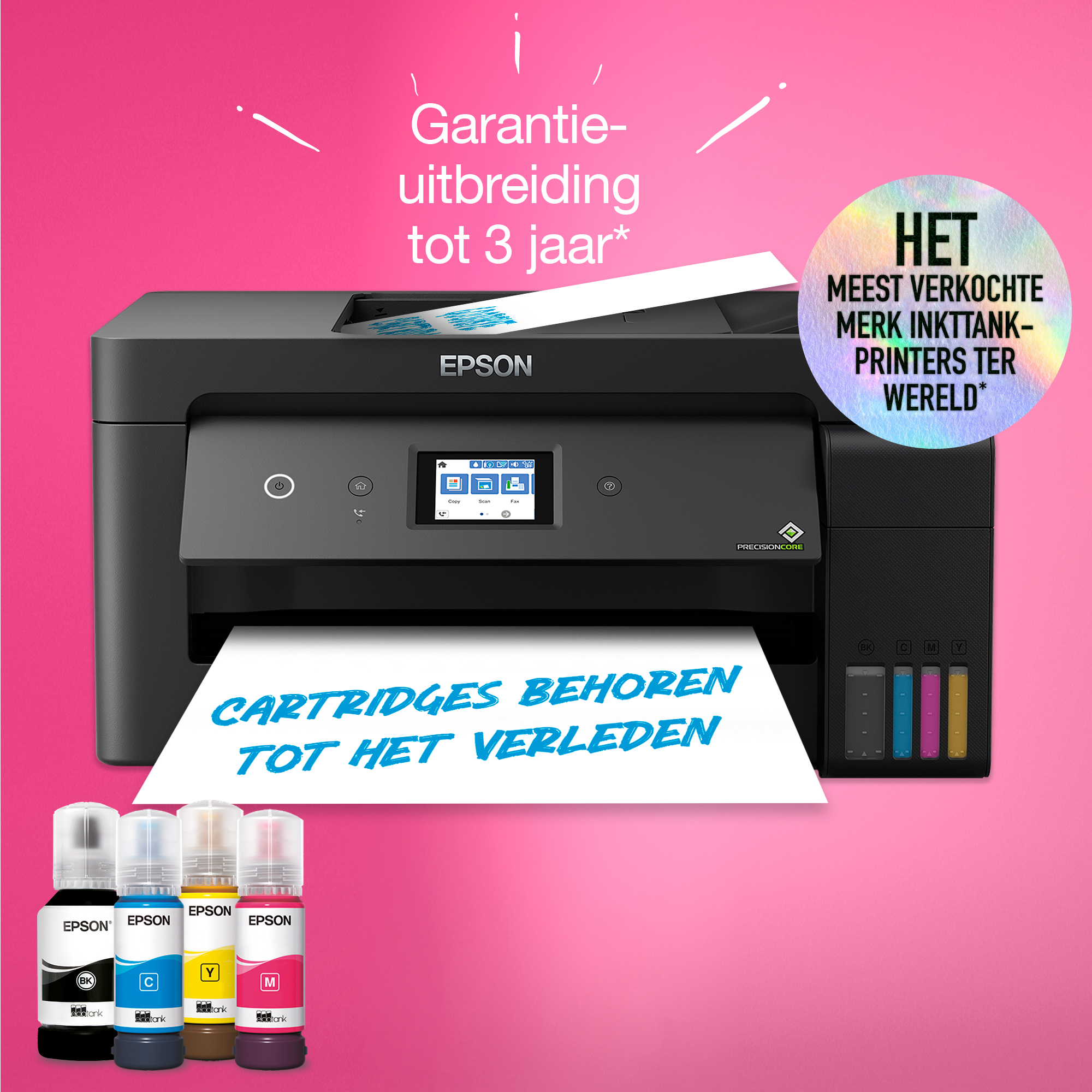 EcoTank is compacter en gebruiksvriendelijker dan ooit. De tanks aan de voorzijde zijn ontwikkeld om zonder knoeien bij te vullen en de flessen zijn zo ontworpen dat alleen de passende kleur kan worden gevuld. Dankzij het inktniveauscherm aan de voorzijde kunt u eenvoudig zien wanneer de tank moet worden bijgevuld.